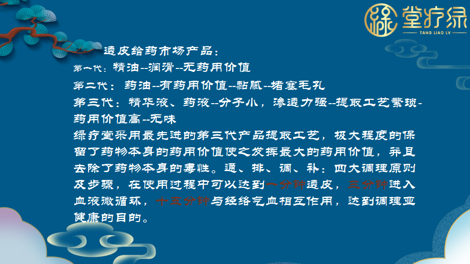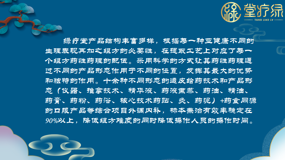 綠療堂產(chǎn)品結(jié)構(gòu)豐富多樣,根據(jù)每一種亞健康不同的生理表現(xiàn)再加之組方的必要性,在提取工藝上對應(yīng)了每一個組方藥性藥理的配伍。采用科學(xué)的方式讓其藥性藥理通過不同的產(chǎn)品形態(tài)作用于不同的位置,發(fā)揮其最大的優(yōu)勢和獨特的作用。十余種不同形態(tài)的透皮給藥技術(shù)和產(chǎn)品形態(tài)( 儀器、推拿技術(shù)、精華液、藥液熏蒸、藥油、精油、藥膏、藥粉、藥浴、核心技術(shù)藥貼、灸、藥泥)+藥食同源的口服產(chǎn)品等綜合項目外調(diào)內(nèi)補,標(biāo)本兼治有效率穩(wěn)定在90%以上,降低組方難度的同時降低操作人員的操作時間。