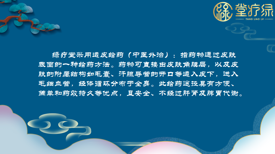 綠療堂采用透皮給藥(中醫(yī)外治):指藥物通過皮膚表面的一種給藥方法。藥物可直接由皮膚角膜層,以及皮膚的附屬結(jié)構(gòu)如毛囊、汗腺導(dǎo)管的開口等透入皮下,進入毛細血管,經(jīng)體循環(huán)分布于全身。此給藥途徑具有方便、簡單和藥效持久等優(yōu)點,且安全、不經(jīng)過肝腎及脾胃代謝。
