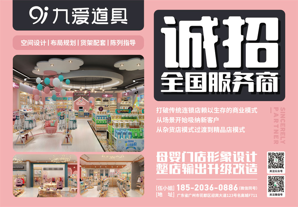 九愛自成立以來,著重為客戶打造差異化的品牌優(yōu)勢(shì),眾多母嬰?yún)^(qū)域連鎖店、全國(guó)加盟店、精品單店等,通過賣場(chǎng)整體形象設(shè)計(jì)、賣場(chǎng)規(guī)范陳列展示,整店道具輸出等一站式服務(wù),全面提升了門店的競(jìng)爭(zhēng)力。