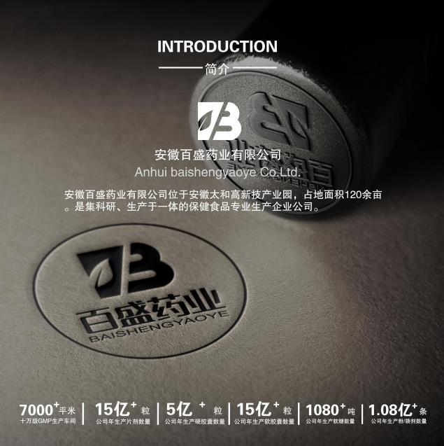 安徽百盛藥業(yè)有限公司,是一家集開發(fā)、生產(chǎn)、銷售為一體的現(xiàn)代化、高科技保健食品專業(yè)生產(chǎn)企業(yè)。公司擁有片劑、顆粒(粉)劑、硬膠囊劑、軟糖、軟膠囊兩個車間四條生產(chǎn)線,均通過生產(chǎn)許可認(rèn)證。生產(chǎn)設(shè)備精良、自動化程度高、工藝先進(jìn),具有同行業(yè)國內(nèi)先進(jìn)水平。具備年產(chǎn)片劑15億片、顆粒(粉)劑1.08億條(袋)、硬膠囊劑3億粒、軟膠囊15億粒、軟糖2000噸的能力。