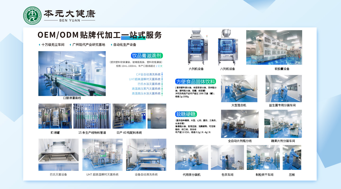 品牌名稱:本元大健康OEM代加工 主營產(chǎn)品:功能性飲品、膏滋、果凍 品牌特色:加工貼牌一站式服務(wù)