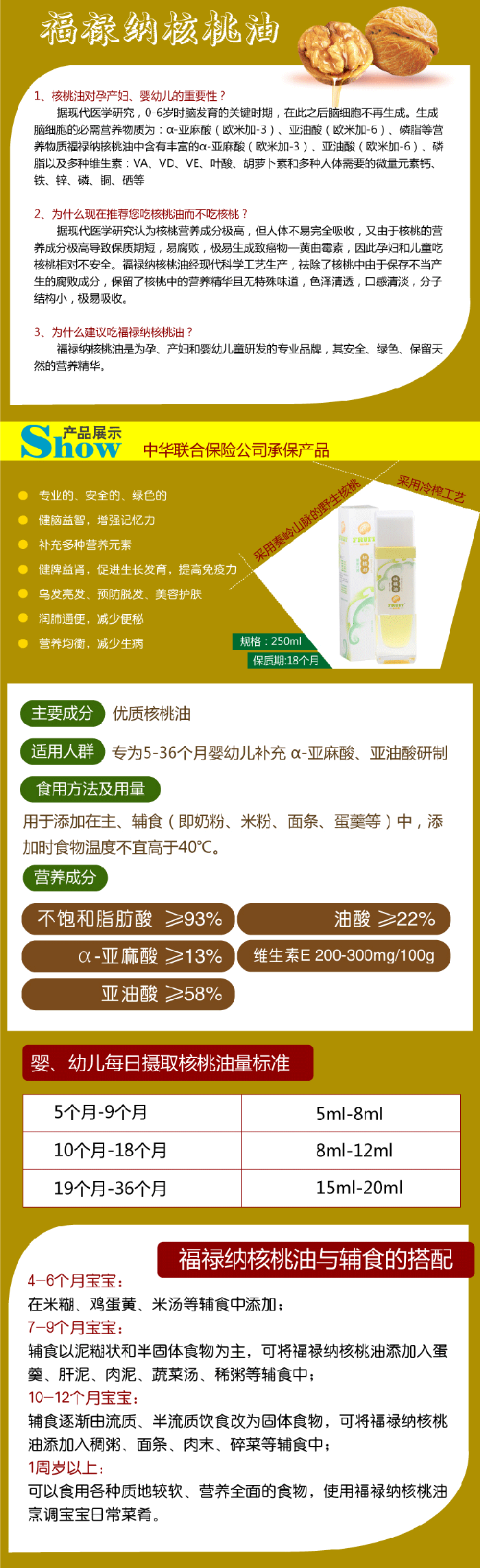 品牌名稱:福祿納 主營產(chǎn)品:福祿納核桃油全國招商 品牌特色:健康,綠色,營養(yǎng),是母嬰上好的營養(yǎng)品。