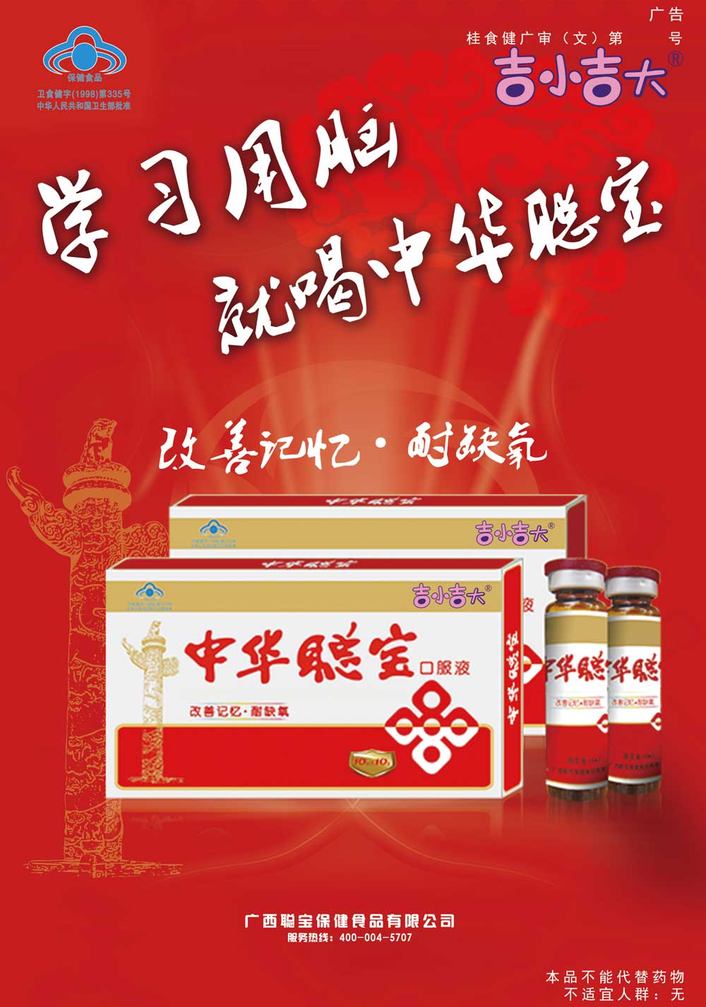 中華聰寶口服液是以黃芪、茯苓、山蓮藕等天然植物為主要原料,經先進生產工藝精制而成的保健食品。本品功能實驗證實可提高記憶商數,具有改善記憶的保健作用,本品還可提高機體對缺氧環(huán)境的耐受能力,具有耐缺氧的保護作用。