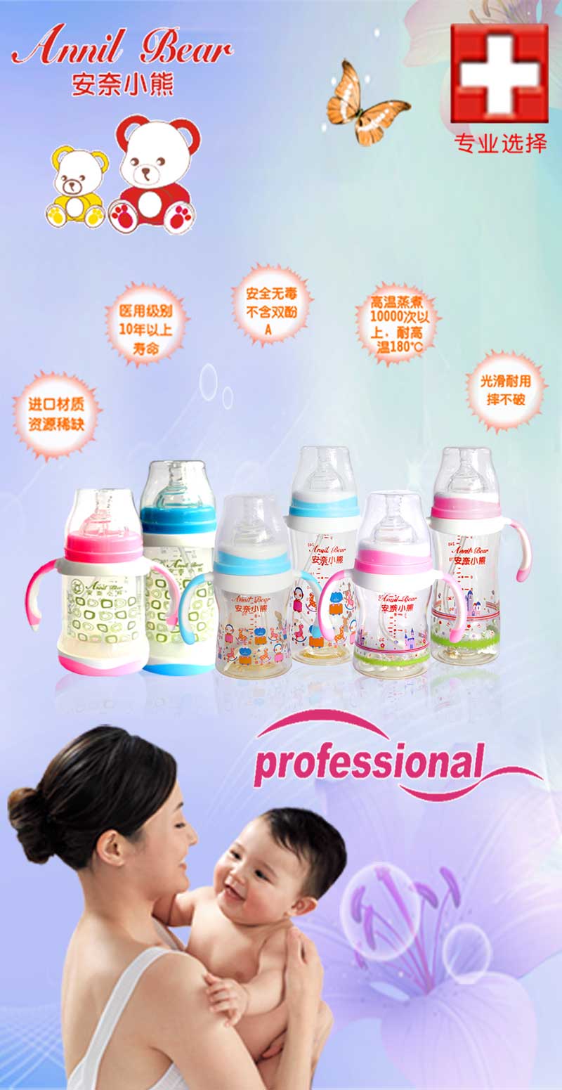 安奈小熊以“原材料安全、設(shè)計(jì)安全、工藝安全”為產(chǎn)品核心,現(xiàn)已開(kāi)發(fā)晶鉆無(wú)痕玻璃奶瓶、硅膠奶瓶、PP奶瓶、PES奶瓶、ppsu奶瓶等奶瓶系列,滿足媽媽不同喂乳選擇需求。