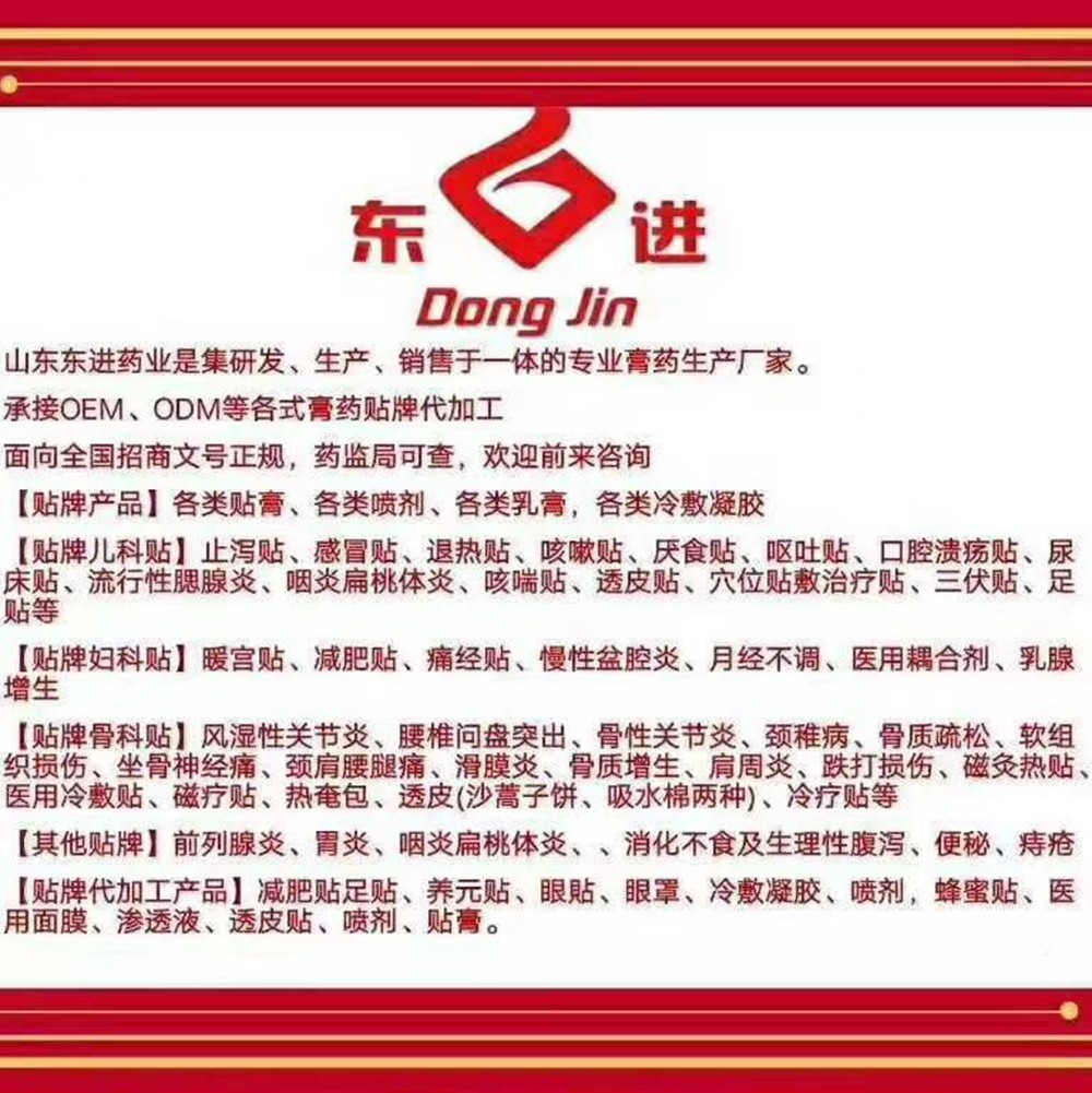 公司主營產(chǎn)品有消痛貼、透骨貼、理療貼、巴布貼、冷敷貼、冷療貼、退熱貼等。山東東進(jìn)擁有業(yè)內(nèi)一流的生產(chǎn)技術(shù),將現(xiàn)代先進(jìn)生產(chǎn)技藝結(jié)合傳統(tǒng)中醫(yī)理論,研制而成的產(chǎn)品,均有非常穩(wěn)定的市場基礎(chǔ)以及一流口碑。