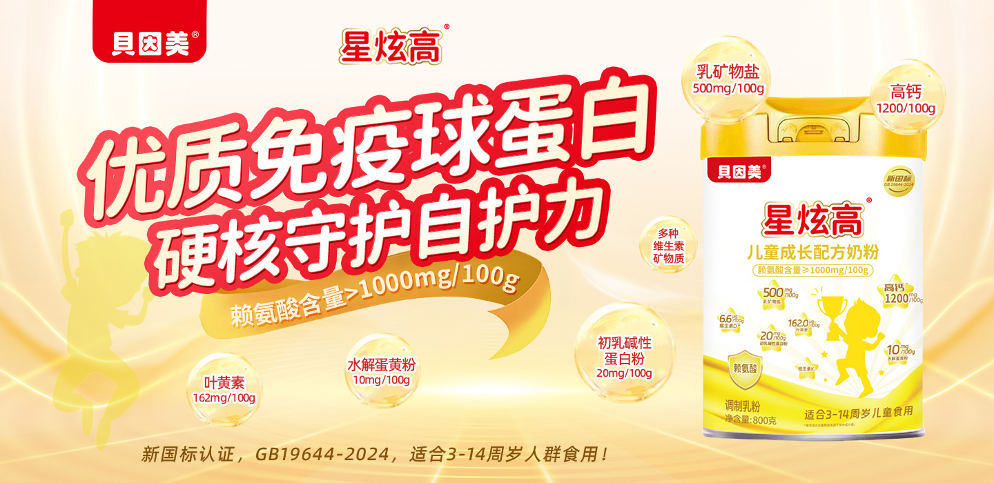 貝因美星炫高兒童成長(zhǎng)配方奶粉,新國(guó)標(biāo)認(rèn)證,GB19644-2024,適合3-14周歲人群食用!嚴(yán)選優(yōu)質(zhì)奶源,源頭把控!賴氨酸含量>1000mg/100g,高含量更營(yíng)養(yǎng)!同時(shí),每100g更添加乳礦物鹽500mg,高鈣1200mg,初乳堿性蛋白粉20mg,水解蛋黃粉10mg,葉黃素162mg,同時(shí)富含多種維生素和礦物質(zhì),均衡營(yíng)養(yǎng)配比,好消化好吸收,守護(hù)成長(zhǎng)健康!