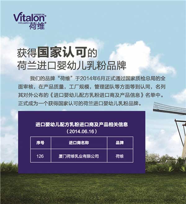 荷維嬰幼兒配方奶粉為荷維乳業(yè)與工廠合作,采用優(yōu)質(zhì)的荷蘭奶源,依據(jù)聯(lián)合國糧農(nóng)組織(FAO)和世界衛(wèi)生組織(WHO)食品法典要求,特別參照中國嬰幼兒的生理特點和營養(yǎng)需求共同研制而成的。