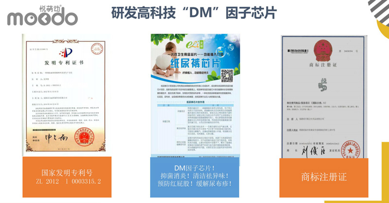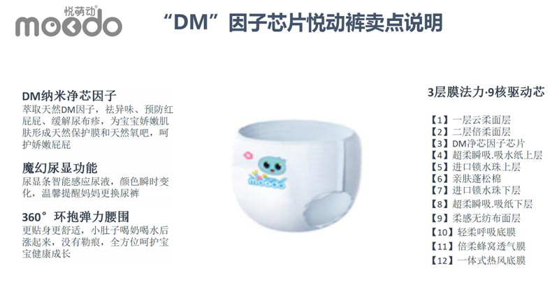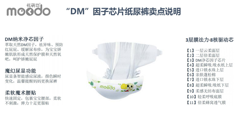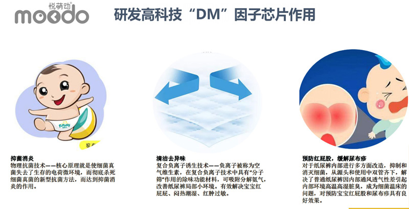悅萌動品牌,產品涵蓋紙尿褲、悅動褲系列,輕薄防漏,羽柔舒適,DM因子芯體,獨具特色。DM因子(diatom)是一種具有分子篩結構的材料,該種結構:具有極強的物理吸附和離子轉換性能!能有效的吸附尿尿所產生的異味、能夠預防紅屁股。