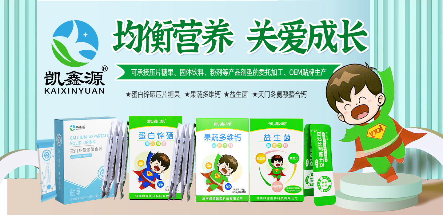 凱鑫源是濟南綠源醫(yī)藥科技有限公司旗下品牌,擁有蛋白鋅硒壓片糖果、果蔬多維鈣固體飲料、益生菌固體飲料、天門冬氨酸鈣固體飲料、山楂內(nèi)金片、雙花苦瓜片、菊苣梔子片等多個市場暢銷產(chǎn)品;并可對外承接壓片糖果、固體飲料、散劑等產(chǎn)品劑型的委托加工、OEM貼牌生產(chǎn)。