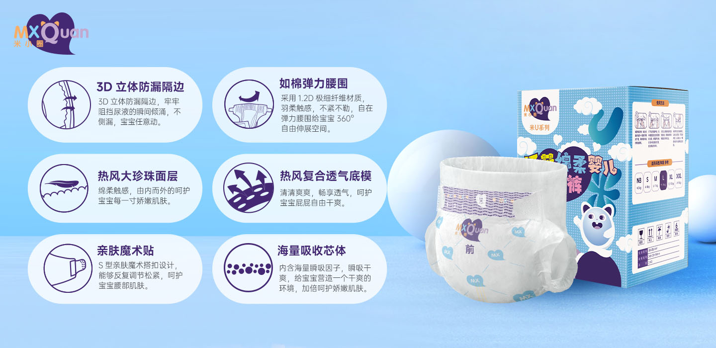 品牌名稱:米小圈 主營(yíng)產(chǎn)品:米小圈嬰兒紙尿褲 品牌特色:柔軟 大吸量 零刺激