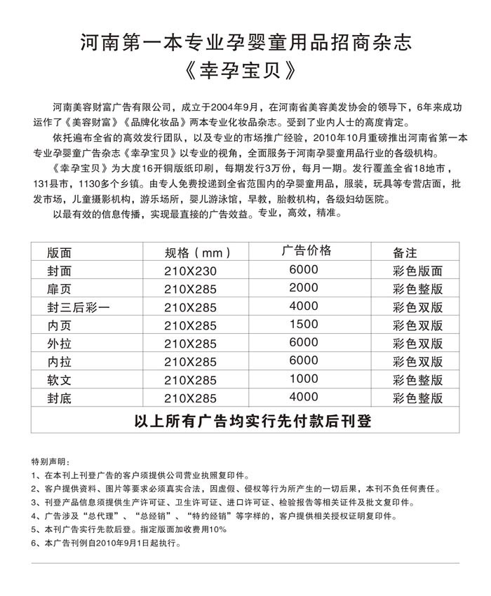 依托遍布全省的高效發(fā)行團(tuán)隊(duì),以及專業(yè)的市場(chǎng)推廣經(jīng)驗(yàn),2010年10月重磅推出河南省第一本專業(yè)孕嬰童廣告雜志《幸孕寶貝》以專業(yè)的視角,全面服務(wù)于河南孕嬰童用品行業(yè)的各級(jí)機(jī)構(gòu)。