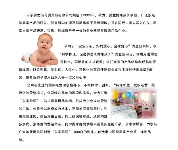公司以“寶寶開心,媽媽放心,全家舒心”為企業(yè)目標(biāo),以“科學(xué)護理,促進嬰幼兒健康成長”為企業(yè)宗旨,利用先進的管理技術(shù),國際化的人才資源;依托強大的品牌效應(yīng),完善的產(chǎn)品結(jié)構(gòu)和成熟的營銷體系;以系列化、專業(yè)化、人性化、精致化的商品伴隨著眾多寶寶度過快樂幸福的時光,使專業(yè)的孕嬰用品深入每一位父母心中!