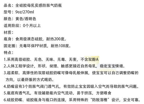 硅膠很柔軟,不用奶瓶刷用手也可以刷到奶瓶的各個角落,容易清洗。寶寶吸奶時,奶瓶會隨著奶水的減少而自動收縮,始終保持著瓶身內(nèi)外氣壓一致,避免寶寶吸入過多的空氣而導(dǎo)致嗆奶、腹脹等不適,有效解決喂奶時脹氣的煩惱,從而達(dá)到自動呼吸的功能。