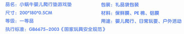 小蝸牛爬行墊無毒無味,防潮隔濕,超大無縫,表面附帶精美的童話圖案,從寶寶學(xué)爬到練習(xí)走路,再到大點(diǎn)在地上玩耍蹦跳,都是不錯(cuò)的選擇,是寶寶健康快樂成長的好伴侶。