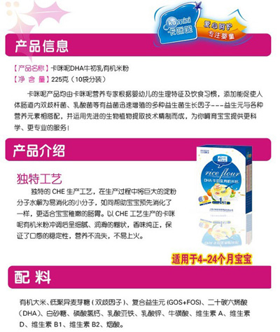 卡咪呢有機(jī)米粉系列是專為中國寶寶設(shè)計(jì)的營養(yǎng)輔食,選用有機(jī)大米,科學(xué)搭配維生素AD等維生素,還特別添加;撬、DHA、AA等有助智力發(fā)育的營養(yǎng)成分,富含15種營養(yǎng)素,F(xiàn)上?ㄟ淠啬笅胗闷酚邢薰久嫦蛉珖瞻资袌鰠^(qū)域誠招卡咪呢有機(jī)米粉代理商。