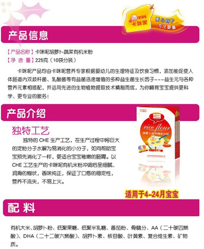 卡咪呢有機米粉系列是專為中國寶寶設計的營養(yǎng)輔食,選用有機大米,科學搭配維生素AD等維生素,還特別添加;撬、DHA、AA等有助智力發(fā)育的營養(yǎng)成分,富含15種營養(yǎng)素,F(xiàn)上海卡咪呢母嬰用品有限公司面向全國空白市場區(qū)域誠招卡咪呢有機米粉代理商。