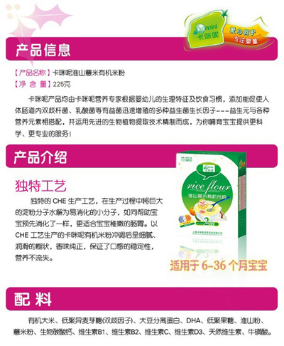 卡咪呢有機(jī)米粉系列是專為中國寶寶設(shè)計(jì)的營養(yǎng)輔食,選用有機(jī)大米,科學(xué)搭配維生素AD等維生素,還特別添加;撬帷HA、AA等有助智力發(fā)育的營養(yǎng)成分,富含15種營養(yǎng)素,F(xiàn)上?ㄟ淠啬笅胗闷酚邢薰久嫦蛉珖瞻资袌鰠^(qū)域誠招卡咪呢有機(jī)米粉代理商。