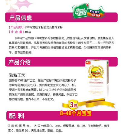 卡咪呢有機米粉系列是專為中國寶寶設(shè)計的營養(yǎng)輔食,選用有機大米,科學(xué)搭配維生素AD等維生素,還特別添加;撬、DHA、AA等有助智力發(fā)育的營養(yǎng)成分,富含15種營養(yǎng)素,F(xiàn)上?ㄟ淠啬笅胗闷酚邢薰久嫦蛉珖瞻资袌鰠^(qū)域誠招卡咪呢有機米粉代理商。