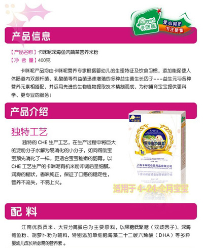 卡咪呢有機(jī)米粉系列是專為中國寶寶設(shè)計(jì)的營養(yǎng)輔食,選用有機(jī)大米,科學(xué)搭配維生素AD等維生素,還特別添加;撬帷HA、AA等有助智力發(fā)育的營養(yǎng)成分,富含15種營養(yǎng)素,F(xiàn)上?ㄟ淠啬笅胗闷酚邢薰久嫦蛉珖瞻资袌鰠^(qū)域誠招卡咪呢有機(jī)米粉代理商。