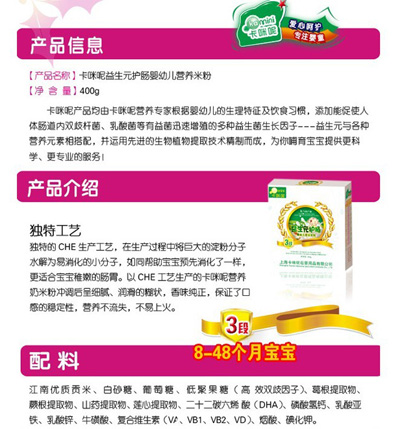 卡咪呢有機米粉系列是專為中國寶寶設(shè)計的營養(yǎng)輔食,選用有機大米,科學(xué)搭配維生素AD等維生素,還特別添加牛磺酸、DHA、AA等有助智力發(fā)育的營養(yǎng)成分,富含15種營養(yǎng)素,F(xiàn)上?ㄟ淠啬笅胗闷酚邢薰久嫦蛉珖瞻资袌鰠^(qū)域誠招卡咪呢有機米粉代理商。