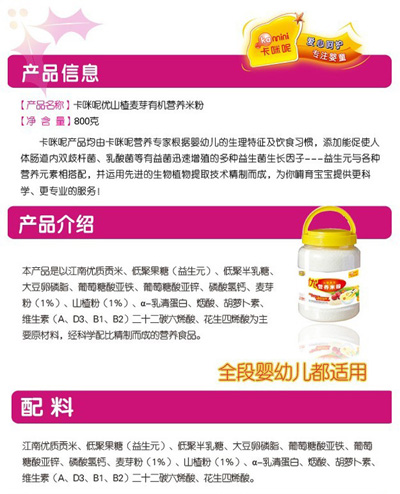 卡咪呢有機米粉系列是專為中國寶寶設計的營養(yǎng)輔食,選用有機大米,科學搭配維生素AD等維生素,還特別添加;撬帷HA、AA等有助智力發(fā)育的營養(yǎng)成分,富含15種營養(yǎng)素。現(xiàn)上?ㄟ淠啬笅胗闷酚邢薰久嫦蛉珖瞻资袌鰠^(qū)域誠招卡咪呢有機米粉代理商。