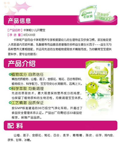 上海卡咪呢母嬰用品有限公司主營母嬰營養(yǎng)保健食品,產(chǎn)品原料來自有機農(nóng)業(yè)生產(chǎn)體系或野生天然產(chǎn)品,通過國家相關有機食品認證機構的嚴格檢測認證,現(xiàn)面向全國空白市場區(qū)域誠招代理商加盟。