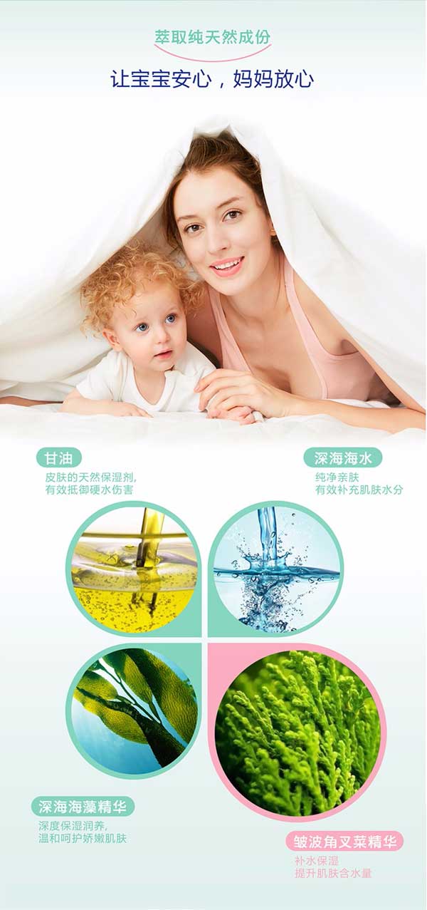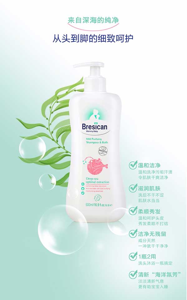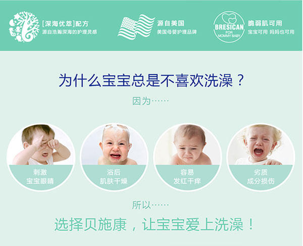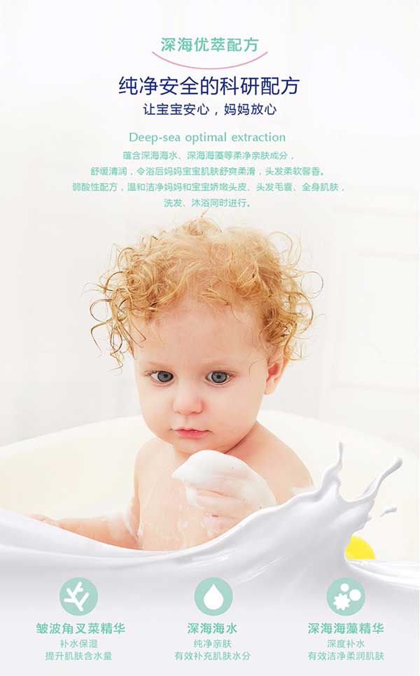 貝施康柔凈洗發(fā)沐浴2合1是 “深海優(yōu)萃”系列的王牌產(chǎn)品,根據(jù)嬰兒特殊肌膚PH特點研制,從深海中萃取自然純凈成分,配方做到純正安全,讓媽媽心安!