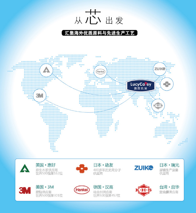 LUCYCAREY露茜凱瑞紙尿褲選用全球頂尖供應(yīng)商的紙尿褲原材料:住友、三大雅高分子吸水材料;美國3M魔術(shù)貼;德國萊卡松緊帶;美國進(jìn)口原生木漿;德國漢高粘合劑;美國、日本進(jìn)口無紡布;進(jìn)口超柔軟透氣底膜等。另外,全世界zui先進(jìn)的全自動紙尿褲生產(chǎn)線,年產(chǎn)銷數(shù)億片紙尿褲的成熟的生產(chǎn)制造團(tuán)隊,確保產(chǎn)品高品質(zhì)。