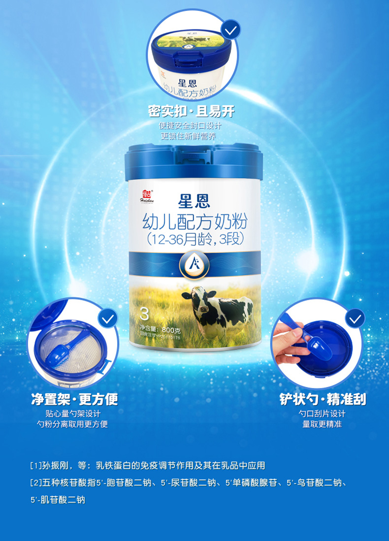 輝山星恩嬰兒奶粉,精選奶源,源頭把控,工藝鎖留,確保奶粉新鮮品質(zhì)。生牛乳入料,并添加了DHA、ARA、益生元、牛磺酸等,科學(xué)配比,滿足成長(zhǎng)階段的營(yíng)養(yǎng)需求。奶香純正,口感細(xì)膩,易消化,好吸收。