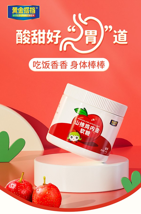 黃金搭檔山楂雞內(nèi)金軟糖,植物草本配方,綠色安全!精選果實(shí)飽滿的優(yōu)質(zhì)山楂為原料,更添加雞內(nèi)金提取物、維生素C等,科學(xué)配比,美味營(yíng)養(yǎng)!以麥芽糖醇代替蔗糖,降低甜度,呵護(hù)幼齒!顆顆獨(dú)立包裝,干凈衛(wèi)生易攜帶,拆袋即食,酸甜口感,拯救“小飯?jiān),讓孩子“食”力全開,茁壯成長(zhǎng)!