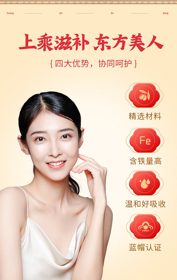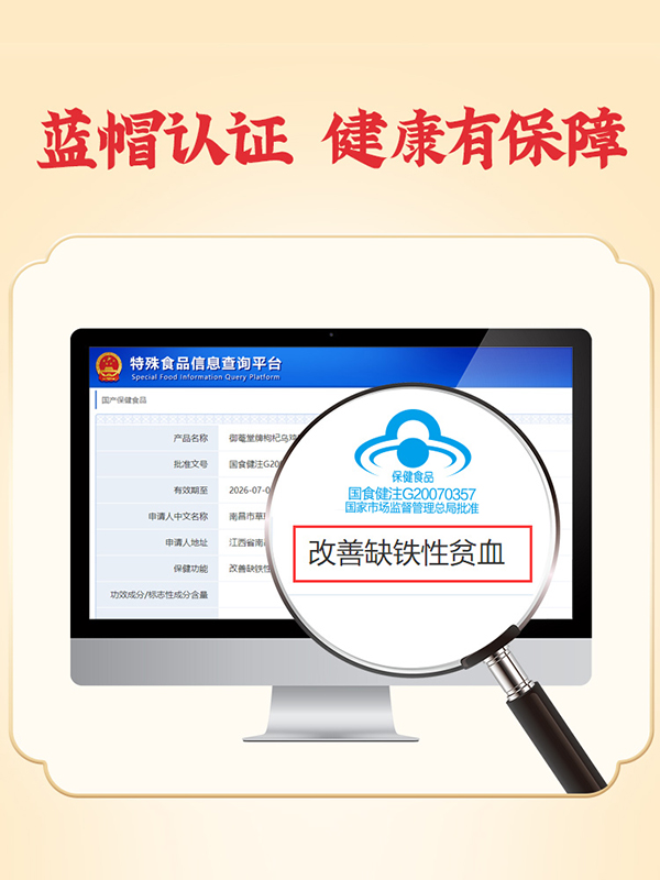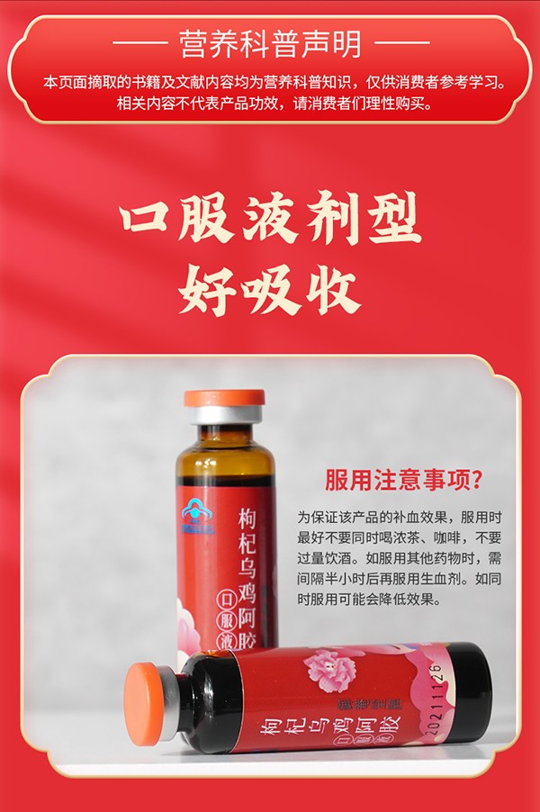 黃金搭檔枸杞烏雞阿膠口服液,藍(lán)帽保健食品,為缺鐵性貧血者精心研制!專注補(bǔ)鐵補(bǔ)血,名副其實(shí)的“血黃金”!精選優(yōu)質(zhì)食材配以藥食兩用原料,如烏雞、枸杞子、大棗、阿膠以及葡萄糖酸亞鐵等等,同時(shí)添加多種微量元素,營(yíng)養(yǎng)成分含量更高,更均衡!每100ml含鐵31.5mg,含粗多糖61mg,上乘滋補(bǔ),溫和好吸收,喚醒好氣色!