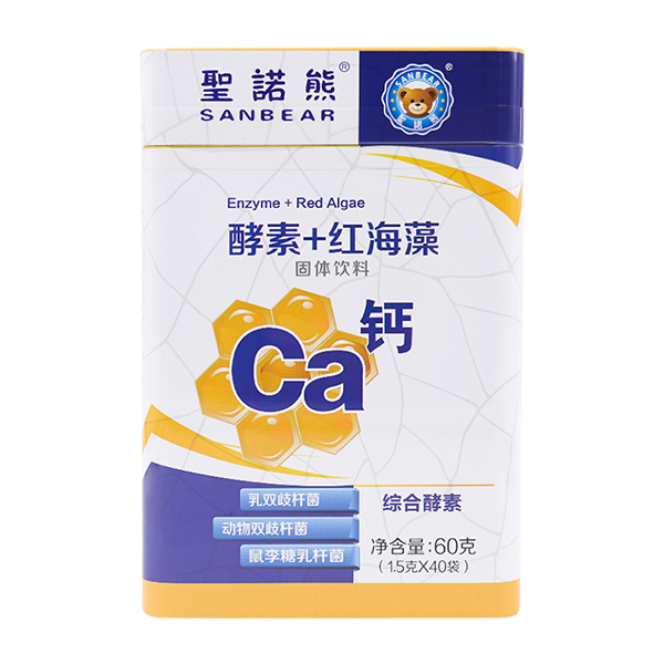 主要成分:葡萄糖、紅海藻粉、豆?jié){粉、碳酸鈣、維生素D3、綜合酵素(木瓜酵素、菠蘿酵素、奇異果酵素)1%、酪蛋白磷酸肽4%、鼠李糖乳桿菌、乳雙歧桿菌、動物雙歧桿菌、(每袋添加300毫克紅海藻粉)