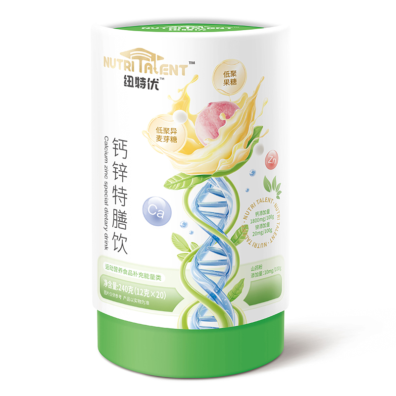 紐特優(yōu)鈣鋅特膳飲,鈣添加量1800mg/100g,鋅添加量20mg/100g,山藥粉添加量10mg/100g,更添加低聚果糖、低聚異麥芽糖等,科學配比,營養(yǎng)好吸收,成長更給力。獨立小包裝,液態(tài)好吸收,即補即營養(yǎng),安全又美味!