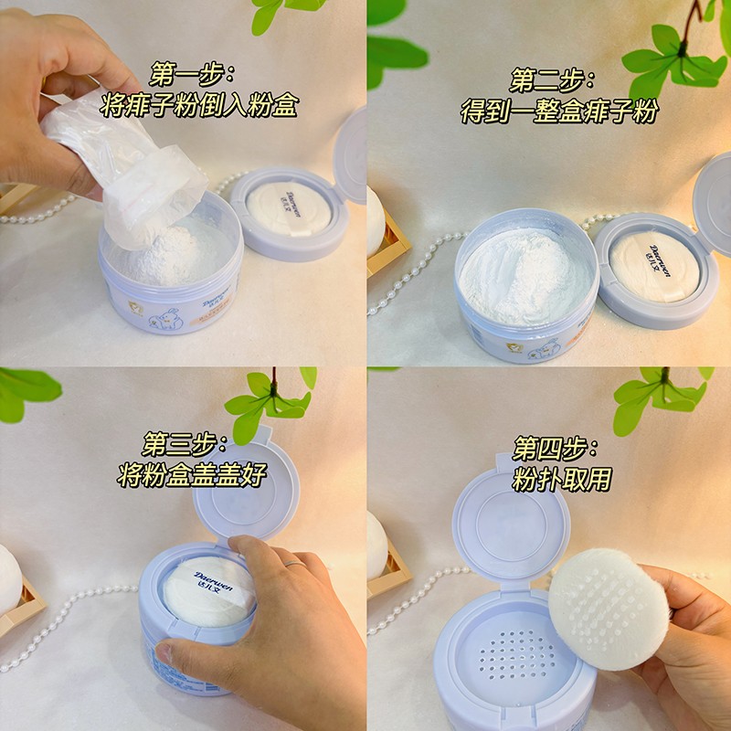 達(dá)兒文寶寶痱子粉,爽身防痱,有效隔離汗液,粉質(zhì)細(xì)膩,不溶于水,清涼干爽。