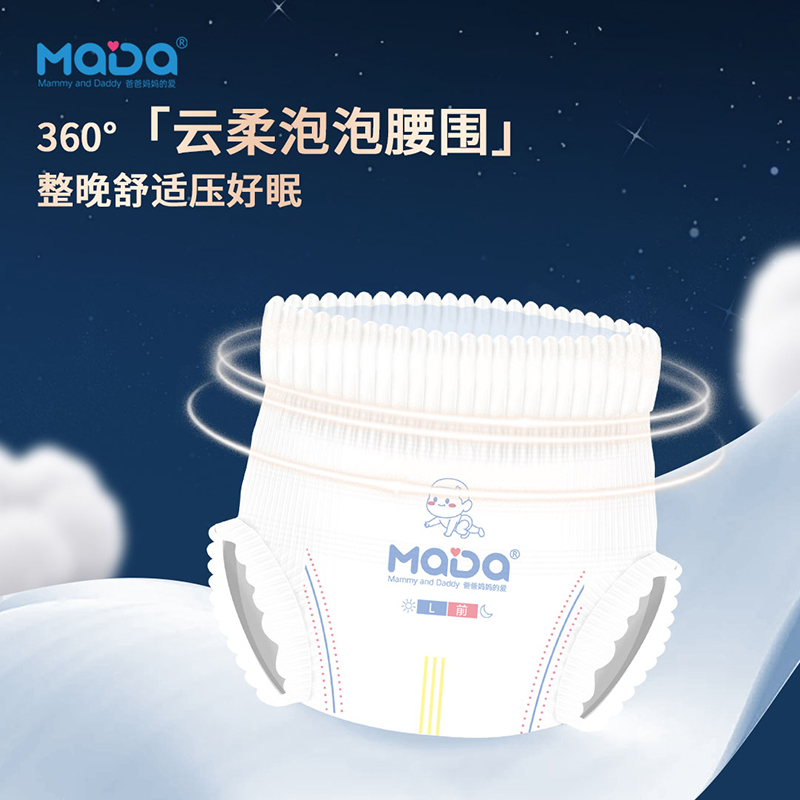 MaDa芯大系列褲型嬰兒紙尿褲,芯大20%,不漏好安心。薄若蟬翼,隔濕透氣,泡點(diǎn)觸膚,干爽舒適,云朵腰圍,柔軟不勒,芯體加寬,瞬吸瞬干。