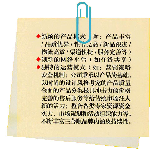 2007 年,三合順制定新時(shí)期發(fā)展戰(zhàn)略,以“童悅”作為公司自有主打品牌,秉承“一切為了孩子”這一核心理念,橫跨自行車和兒童用品兩大行業(yè),專業(yè)從事系列化兒童用品創(chuàng)新研發(fā)、組織生產(chǎn)、外貿(mào)內(nèi)銷和文化服務(wù),建立覆蓋“供—產(chǎn)—儲(chǔ)—運(yùn)—展—銷—交—服”供應(yīng)鏈系統(tǒng)解決方案的強(qiáng)勢品牌。同時(shí),三合順與北京中卡世紀(jì)動(dòng)漫文化傳媒有限公司達(dá)成戰(zhàn)略合作,制作品牌動(dòng)畫片,全程助力“童悅”品牌形象的創(chuàng)建和推廣。