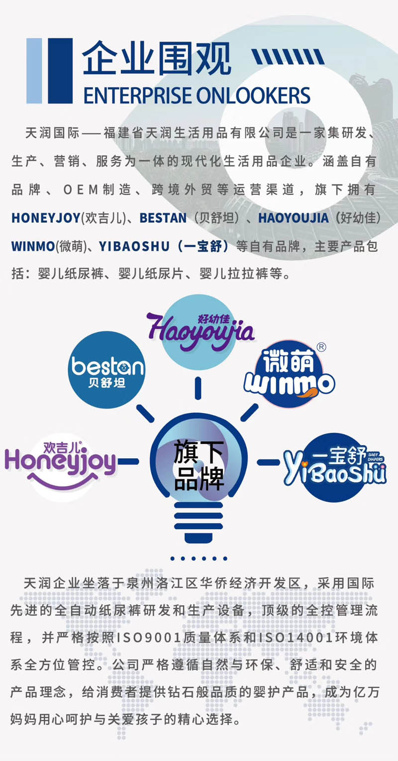 天潤國際——福建省天潤生活用品有限公司是一家集研發(fā)、生產(chǎn)、營銷、服務(wù)為一體的現(xiàn)代化生活用品企業(yè),涵蓋自有品牌、OEM制造、跨境外貿(mào)等運營渠道,旗下?lián)碛?HONEYJOY(歡吉兒)、BESTAN(貝舒坦)、HAOYOUJIA(好幼佳)、WINMO(微萌)、YIBAOSHU(一寶舒)等自有品牌,主要產(chǎn)品包括:嬰兒紙尿褲、嬰兒紙尿片、嬰兒拉拉褲等。