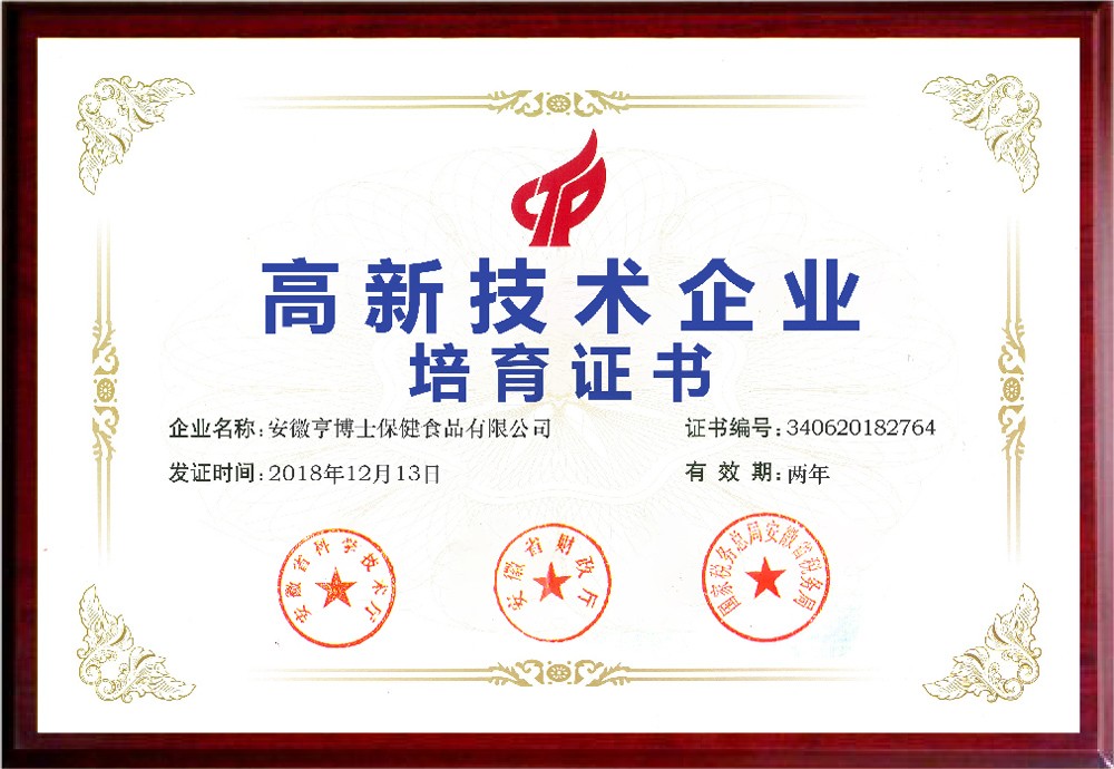 亨博士,安徽亨博士保健食品有限公司旗下品牌,它是一家集研發(fā)、生產(chǎn)、銷售于一體的現(xiàn)代化健康食品生產(chǎn)企業(yè),公司于2013年成立,2017年初獲批食品生產(chǎn)許可證,2018年獲批“亨博士功能性食品研發(fā)中心”,“ISO9000認(rèn)證”,目前擁有1萬平米凈化車間,100多名員工,10多名研發(fā)人員,與阜陽大學(xué),安徽農(nóng)業(yè)大學(xué)簽署產(chǎn)學(xué)研協(xié)議,公司先后獲得“省級專精特新中小企業(yè)”、“國家高新技術(shù)培育企業(yè)”、“市級十佳青年明星企業(yè)”、“市級農(nóng)業(yè)產(chǎn)業(yè)龍頭企業(yè)”等榮譽(yù)稱號。