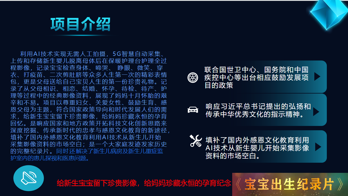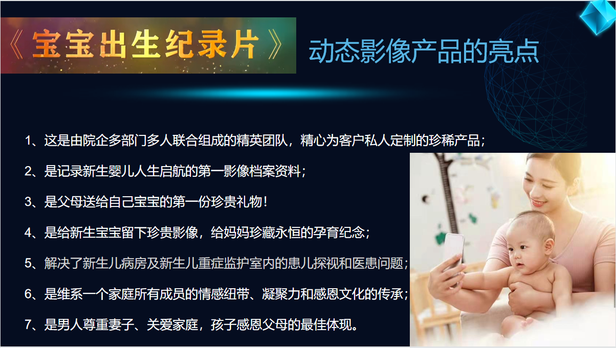 利用國家相關政策的支持,與婦幼婦產(chǎn)醫(yī)院合作,以AI技術自主研發(fā)的專利產(chǎn)品實現(xiàn)5G智慧采集新生兒影像資料,制作一部具有珍藏無價、永恒留戀、尊重婦女、關愛女性、鼓勵生育、感恩父母的動態(tài)影像——《寶寶出生紀錄片》。