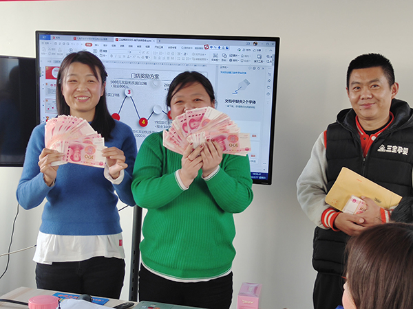 除了新品的講解,“施貝安”品牌針對(duì)線(xiàn)下門(mén)店所推出的門(mén)店獎(jiǎng)勵(lì)方案亦是誠(chéng)意滿(mǎn)滿(mǎn),給銷(xiāo)售冠軍們的獎(jiǎng)勵(lì)更是絲毫不含糊!白花花的百元大鈔送到各位銷(xiāo)售精英的手中,看著她們一個(gè)個(gè)洋溢著幸福的笑臉,亦是對(duì)“施貝安”品牌的高度認(rèn)可!