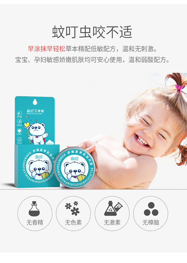 麻哈艾草膏產(chǎn)品,主要針對蚊叮后的皮膚外搽使用,可以有效的舒緩蚊蟲叮咬后的皮膚劇癢,滋潤舒緩,微涼舒適。蚊叮蟲咬不適,早涂抹早輕松草本精配低敏配方,溫潤無刺激。寶寶孕婦敏感嬌嫩肌膚均可安心使用,是居家常備,出游佳選。