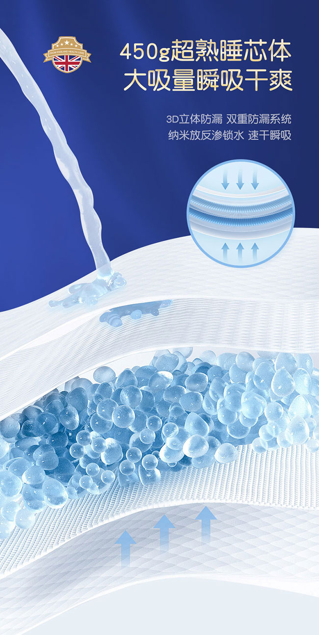 450g 超熟睡芯體,大吸量且瞬吸干爽。3D 立體防漏結(jié)合雙重防漏系統(tǒng)與納米反滲鎖水,速干瞬吸。甄選日本易艾斯纖維等親水面料,熱風(fēng)面層減少摩擦,打造柔滑內(nèi)表層。第三代全芯體,一夜一片,干爽 12 小時,保障睡眠。