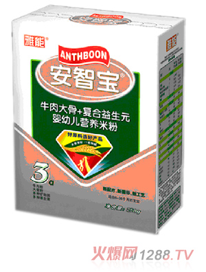 雅能安智寶嬰兒奶粉是針對目前中國的營養(yǎng)需求,并進行深入研究,研制而出的適合中國食用的嬰兒奶粉。它的生產(chǎn)采用封閉式全自動奶粉生產(chǎn)線,其質(zhì)量符合世界衛(wèi)生組織聯(lián)合國糧農(nóng)組織(WHOFAO)推薦的標準。
