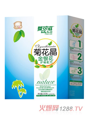 嬰可滋根據(jù)中國bao--bao的飲食習(xí)慣不同、口味不同共推出益生元護暢菊花晶、雙歧因子護暢菊花晶、鈣鐵鋅優(yōu)暢菊花晶、蓮心護暢菊花晶、蓮心護暢菊花晶、蜂蜜菊花護暢菊花晶,不同配方,同樣降火,不同的營養(yǎng)支持幫助bao--bao成長。