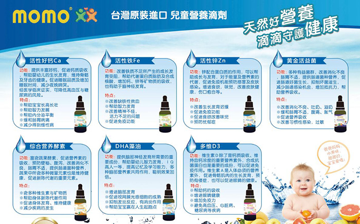 momo營養(yǎng)素滴劑系列,100%臺(tái)灣原罐原裝,正規(guī)進(jìn)口食品,安全有保障。臺(tái)灣專業(yè)研發(fā)團(tuán)隊(duì),采用本土原材料,采用嚴(yán)格的自我生產(chǎn)管理系統(tǒng),從 產(chǎn)品開發(fā)、原來生產(chǎn)到末端產(chǎn)品的包裝,提供完整的品質(zhì)服務(wù)。現(xiàn)正面向全國招商中,有意向者現(xiàn)在就可以通過火爆嬰童網(wǎng)進(jìn)行留言咨詢。