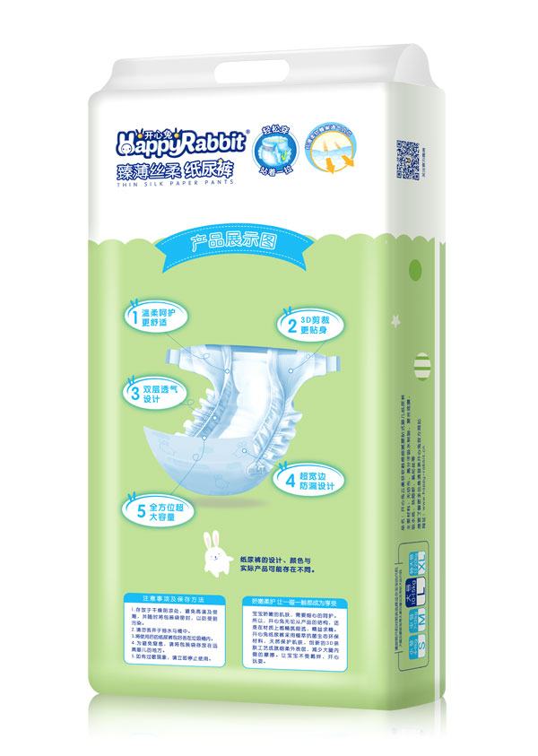 “開心兔”是廣州世盛貿(mào)易有限公司旗下紙尿褲品牌,致力于為媽媽和寶寶提供更全面更周到的服務,開心兔系列紙尿褲5D維度立體剪裁,讓寶寶時刻樂動,舒適自如;0.2mm超薄芯體設計無墜力;進口SAP雙分子搭配獨特導流設計,強瞬瑣吸,不起坨,不斷層;大環(huán)腰彈性立體腰圍,柔如媽媽的懷抱;超級綿柔內(nèi)層面溫暖呵護;千萬個納米透氣小孔的PE透氣層,干爽透氣不紅PP;開心兔紙尿褲,250毫升水6秒瞬吸鎖水、60秒瞬吸無反滲,1片高于同類產(chǎn)品30%鎖水力。