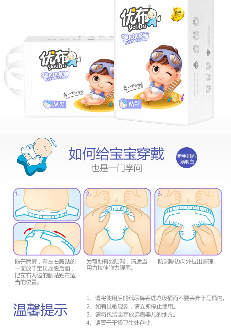 “優(yōu)布”是優(yōu)布時代生活用品(湖南)有限公司旗下品牌,公司是一家專業(yè)從事嬰幼兒護理用品研發(fā)、生產(chǎn)及銷售的現(xiàn)代化企業(yè),專注于嬰童事業(yè)的發(fā)展,專注于品質(zhì)和社會責(zé)任,主營嬰兒紙尿褲、嬰兒紙尿片,全方位呵護寶寶健康。秉承“市場主導(dǎo),質(zhì)量取勝,誠信經(jīng)營,客戶滿意”的核心理念,注重銷售網(wǎng)絡(luò)建設(shè),F(xiàn)已開發(fā)湖南、湖北、江西、貴州、四川、重慶等代理經(jīng)銷商,贏得了廣大經(jīng)銷商和消費者的信賴與支持。