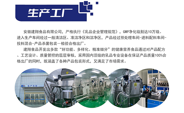安徽建翔食品有限公司(簡(jiǎn)稱建翔食品)成立于2003年,企業(yè)在2020年被安徽省重點(diǎn)招商引資的乳制品專業(yè)企業(yè),是安徽省唯一一家調(diào)制乳粉工廠,也是國(guó)內(nèi)專業(yè)健康食品解決方案供應(yīng)商,集調(diào)制奶粉、特色乳制品、營(yíng)養(yǎng)保健品、功能性營(yíng)養(yǎng)品等研發(fā)、生產(chǎn)、銷售于一體。