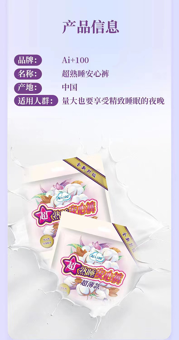 Ai+100,專業(yè)的護(hù)理用品品牌,主營產(chǎn)品有衛(wèi)生巾,安睡褲,精選原料,觸感輕柔,絲薄透氣,緩解悶悶的感覺,忘卻姨媽感,云感親膚,自在每一天,安享精致睡眠。