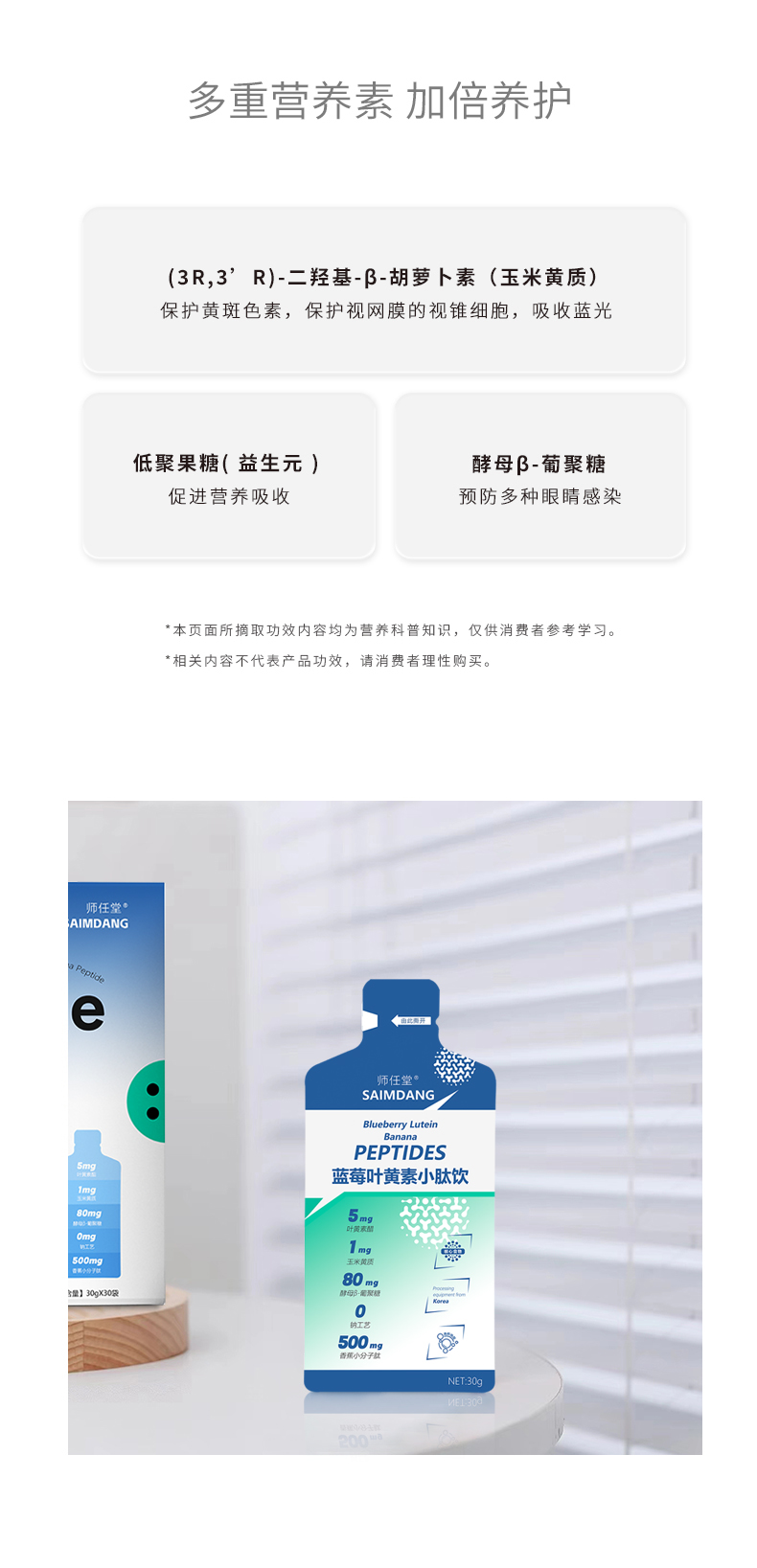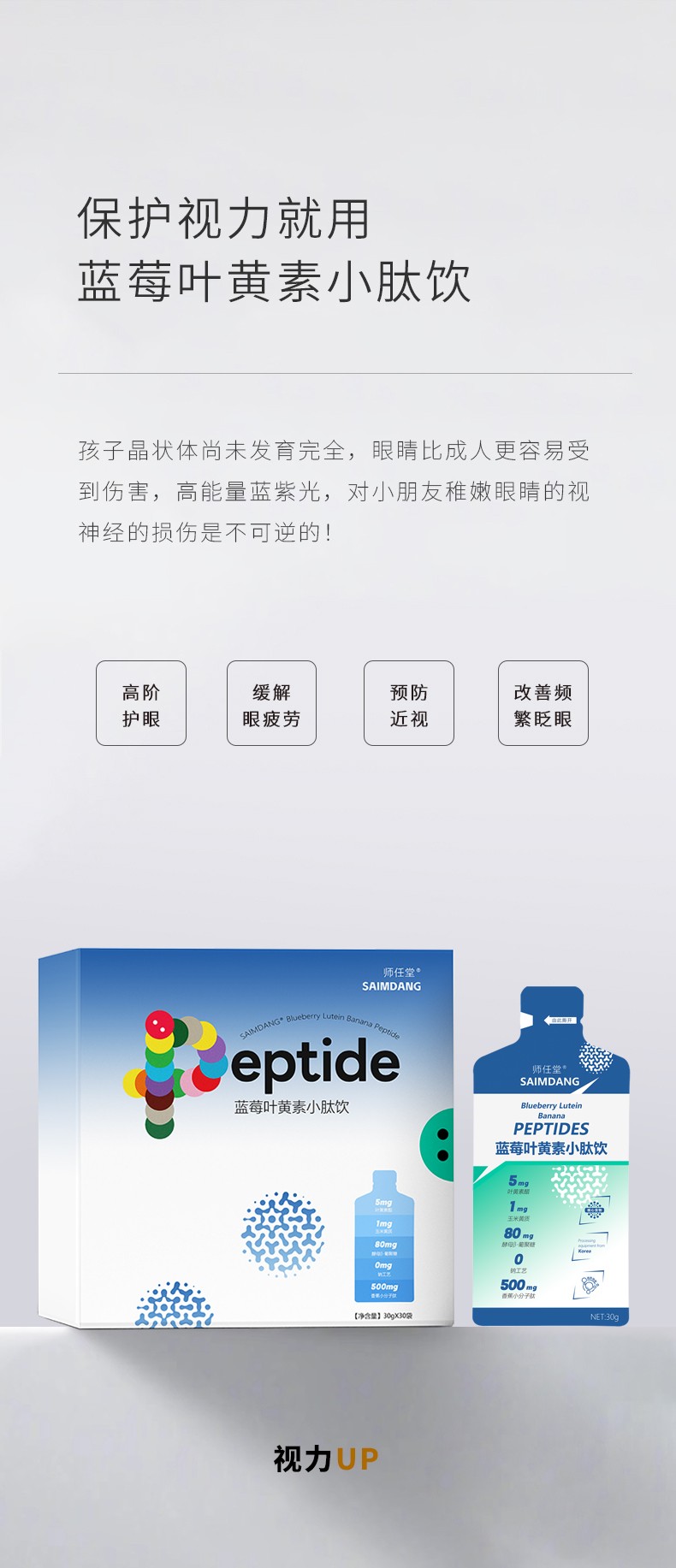 師任堂藍(lán)莓葉黃素小肽飲,少年兒童專(zhuān)研配方,“葉黃素酯+玉米黃質(zhì)”5:1黃金比例,科學(xué)護(hù)眼。搭配藍(lán)莓、低聚果糖(益生元)、酵母β-葡聚糖,特別添加香蕉小分子肽,多種營(yíng)養(yǎng)協(xié)同補(bǔ)充,加倍養(yǎng)護(hù),抵御強(qiáng)藍(lán)光,滿(mǎn)分護(hù)視力!高含量小分子肽,成分更易吸收,不增加腸胃負(fù)擔(dān)。